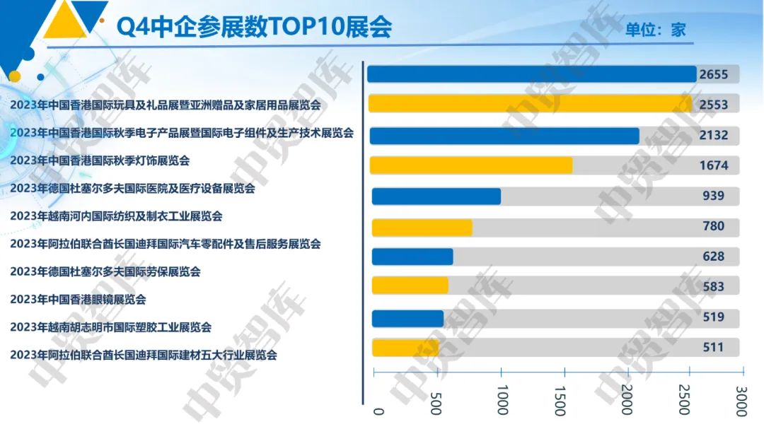 3.Q4参展数Top10展会头部效应明显。Q4中企共参加27202场境外展,展会创新发展动力持续增强,Q4参展数Top10展会详见下表。从中国参展商数来看,前四大展会分别是2023年中国香港国际玩具及礼品展暨亚洲赠品及家居用品展览会(2655家)、2023年中国香港国际秋季电子产品展暨国际电子组件及生产技术展览会(2553家)、2023年中国香港国际秋季灯饰展览会(2132家)和2023年德国杜塞尔多夫国际医院及医疗设备展览会(1674家),前往这4个展会的展商数占Top10展会展商数的69.46%,占比较大,头部效应明显。