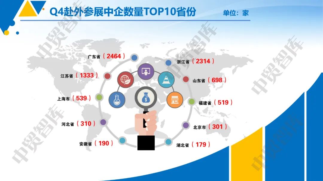 1.沿海地区赴外参展积极性高,实力强劲。从赴外参展商数量TOP10的省份和城市来看,外贸大省强市依然是参展主力军,沿海地区城市(深圳市、宁波市、上海市、广州市、温州市、台州市)在Q4的TOP10城市中占比72.17%。Q4赴外参展商数量TOP10的省份(直辖市)分别是广东省(2464家)、浙江省(2314家)、江苏省(1333家)、山东省(698家)、上海市(539家)、福建省(519家)、河北省(310家)、北京市(301家)、安徽省(190家)、湖北省(179家)。