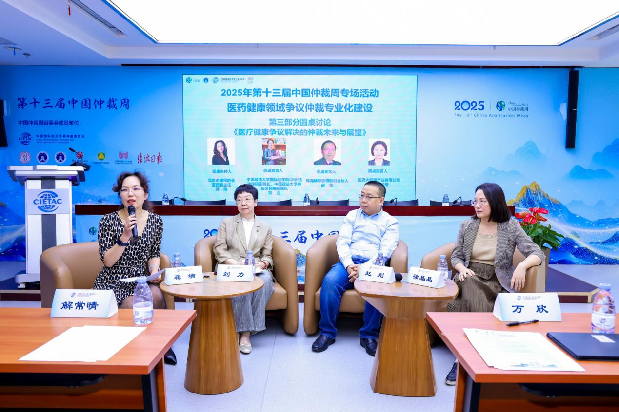 第三个议题由北京市律师协会医药委主任龚楠主持,中国政法大学国际法学院、涉外法治学院副院长刘力,珠海横琴软银欣创合伙人赵刚,国药大健康产业有限公司法务部经理徐晶晶围绕行业专业化服务需求、医药企业法律风险防范、仲裁与法院系统的程序救济衔接等展开深度研讨,擘画医疗健康争议仲裁的发展未来。