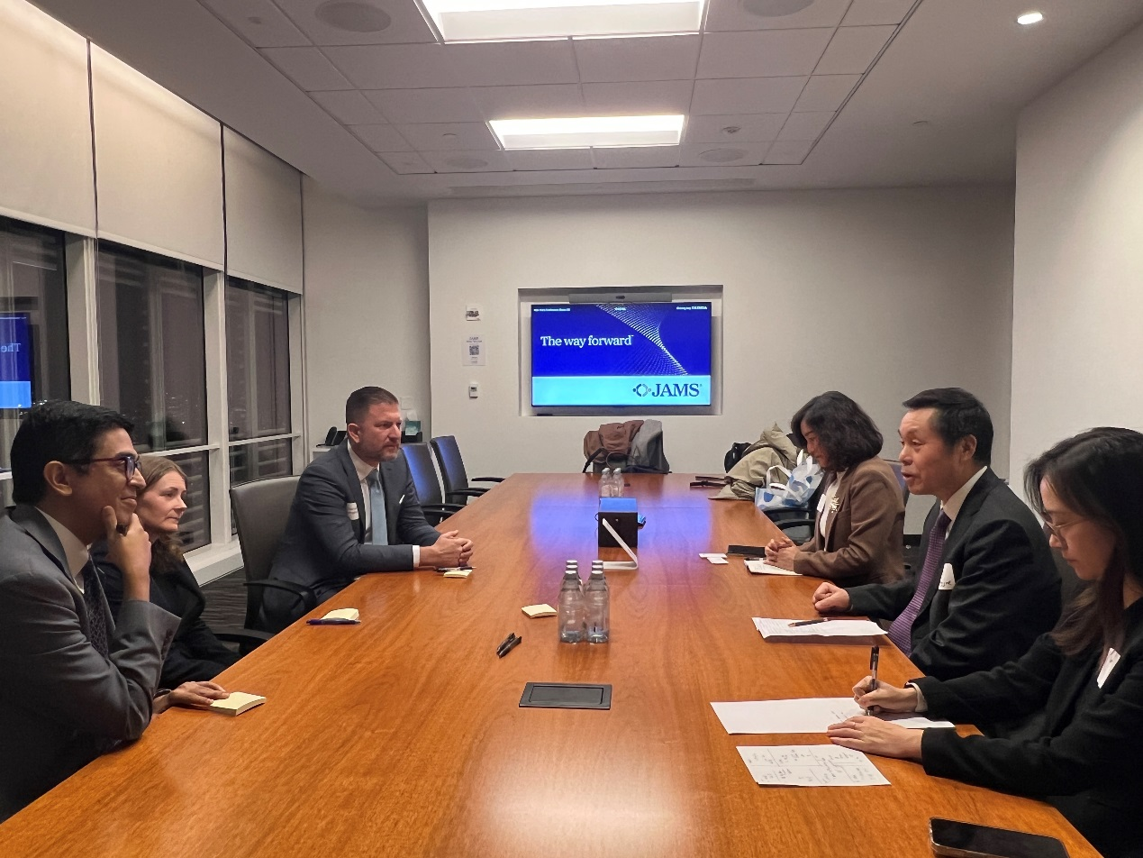 2025年11月18日,中国国际经济贸易仲裁委员会(贸仲)副主任兼秘书长王承杰率代表团在美国纽约参加仲裁周期间,拜访美国司法仲裁调解服务机构JAMS并与该机构国际事业发展总监Sherman Humphrey及哥伦比亚大学法学院国际商事与投资仲裁中心高级研究员兼顾问Kabir Duggal教授座谈交流。王承杰秘书长对两机构与贸仲在纽约仲裁周期间共同举办活动表示感谢,并就加强国际仲裁合作和人才培养等议题进行了讨论。