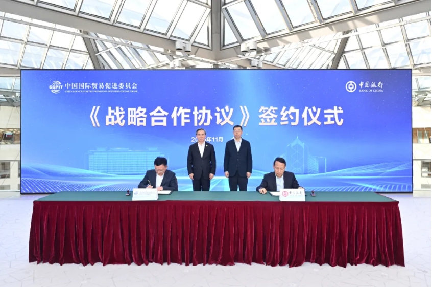 11月28日,中国贸促会会长任鸿斌在北京与中国银行董事长葛海蛟进行工作交流,共同见证双方代表签署战略合作协议。中国贸促会副会长聂文慧、中国银行副行长杨军出席活动。